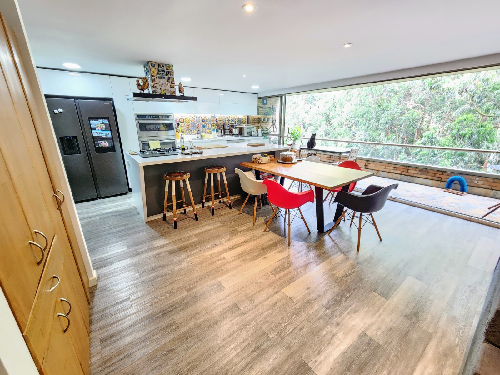 Cuenta con 194 metros cuadrados en total. En el primer piso te encuentras con área social amplia con cocina abierta moderna, balcón abierto amplio, zona de ropas, habitación de servicio con baño y medio baño social, escaleras en madera, Segundo piso con salón amplío y biblioteca con escritorios, dos habitaciones con baño privado y closet y habitación principal con balcón, vestier y baño amplio.