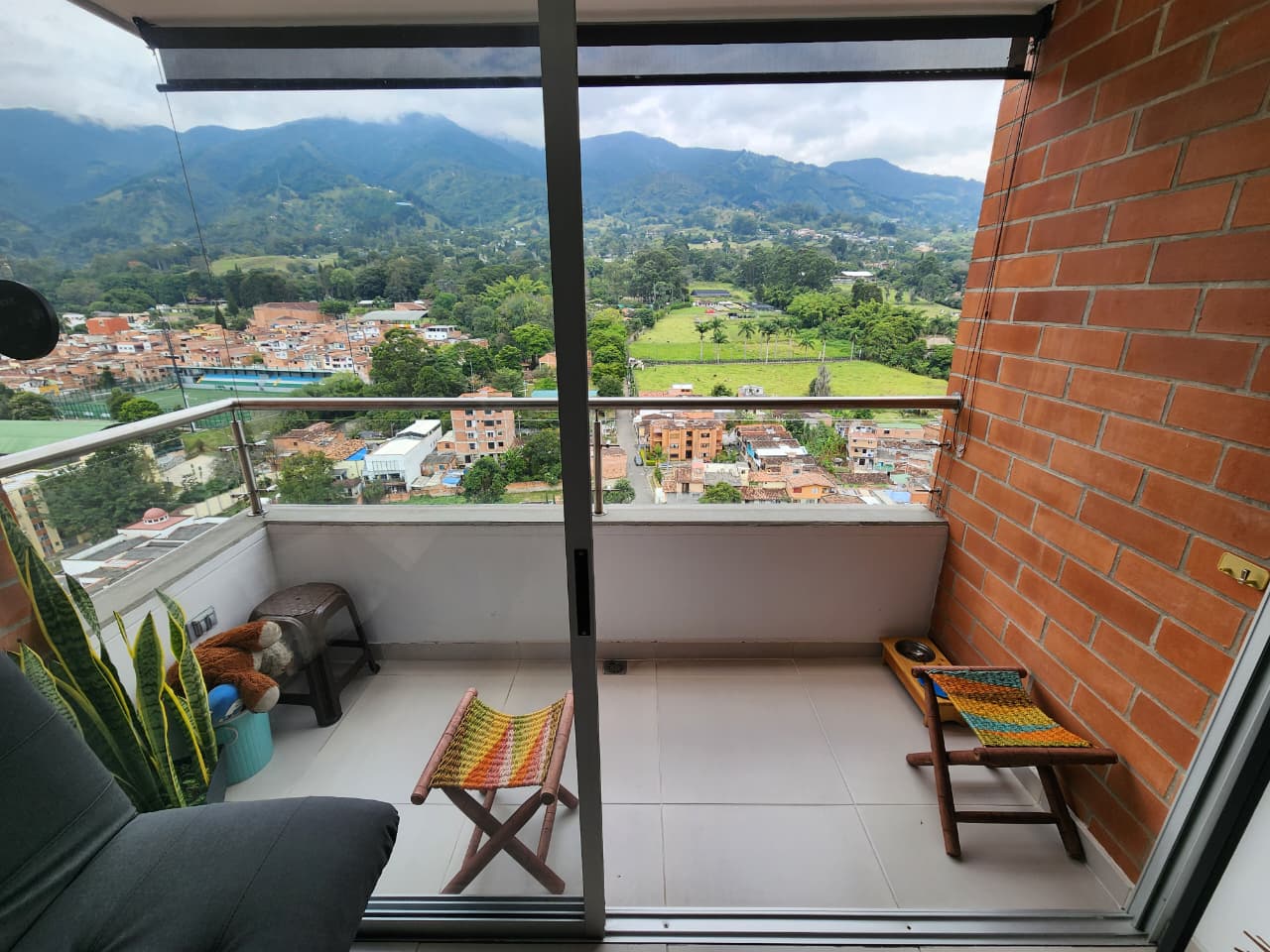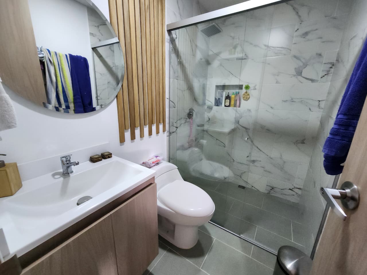 El apartamento cuenta con un área de 78 m2, cocina integral , zona de ropas independiente, sala comedor, espacio para estudio, balcón amplio con vista a las montañas, 1 baño social completo, 2 habitaciones auxiliares con closet y la habitación principal con baño y closet grande.
