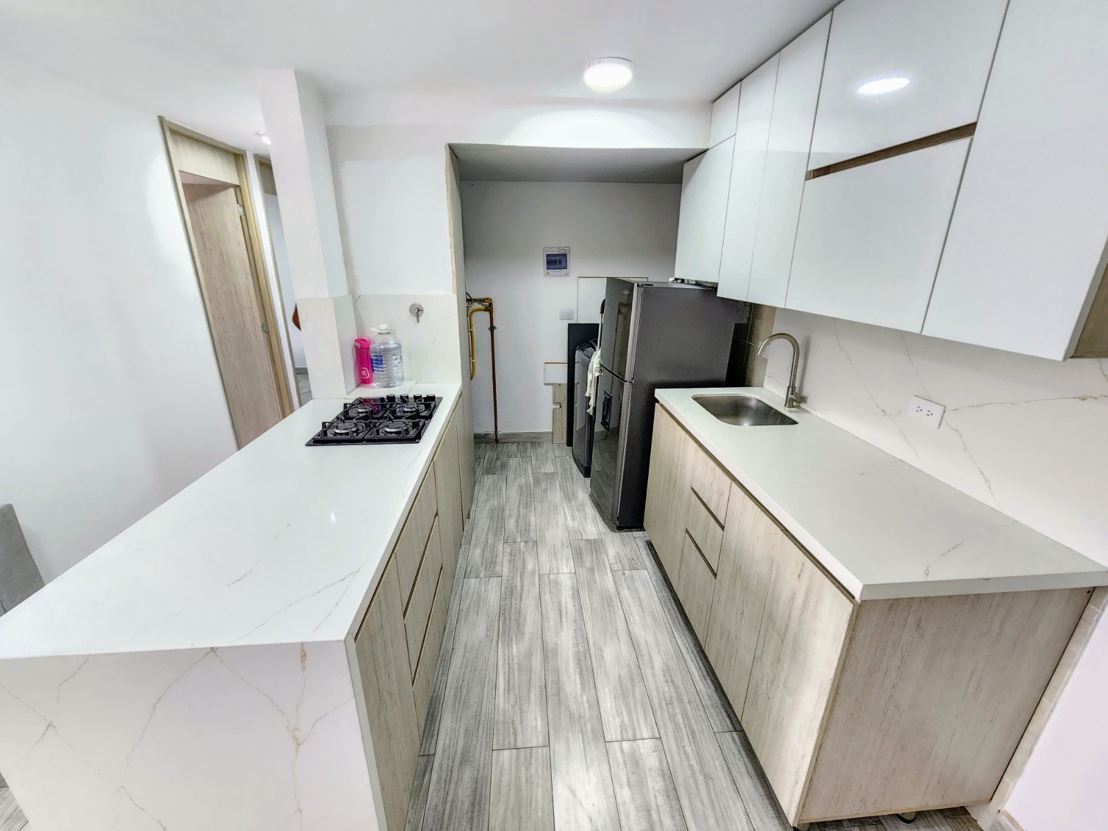 Cuenta con 46 m2, cocina integral, zona de ropas, salacomedor, balcón con muy buena vista, 2 habitaciones, 2 baños y los parqueaderos son comunales.